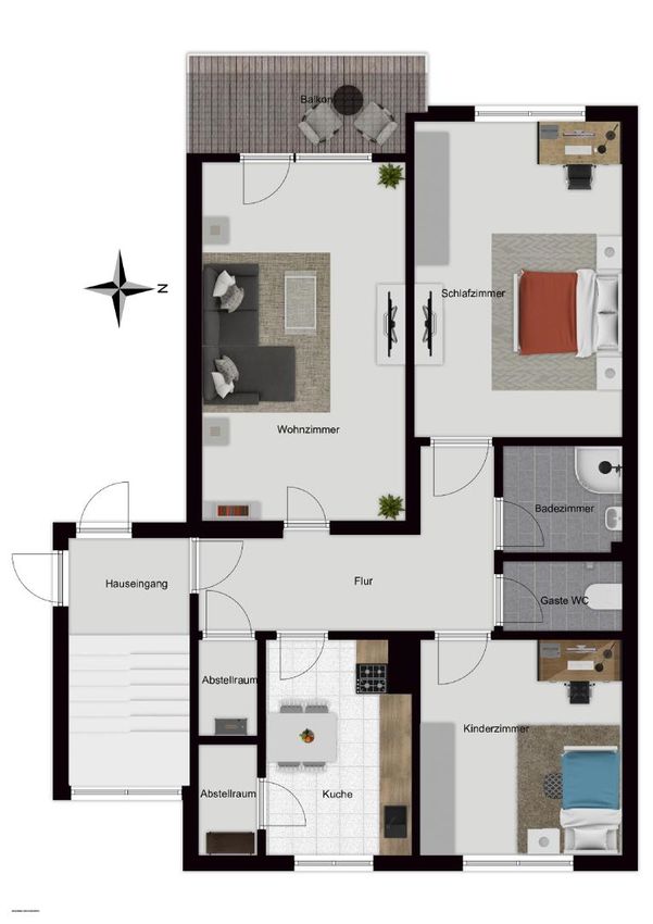 Die Wohnung bietet einen großzügigen Wohnbereich, zwei Schlafzimmer, eine separate Küche mit Abstellraum, ein Badezimmer sowie ein separates WC. Hochwertige Holzböden verleihen den Räumen eine besonders gemütliche Atmosphäre und sorgen für ein angenehmes Wohngefühl.