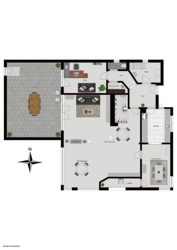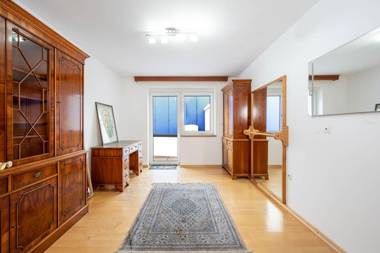 Ein weiteres Plus ist die große Terrasse, die viel Platz für Gartenmöbel, Pflanzen oder entspannte Sommerabende bietet und das Wohnen ins Freie erweitert.