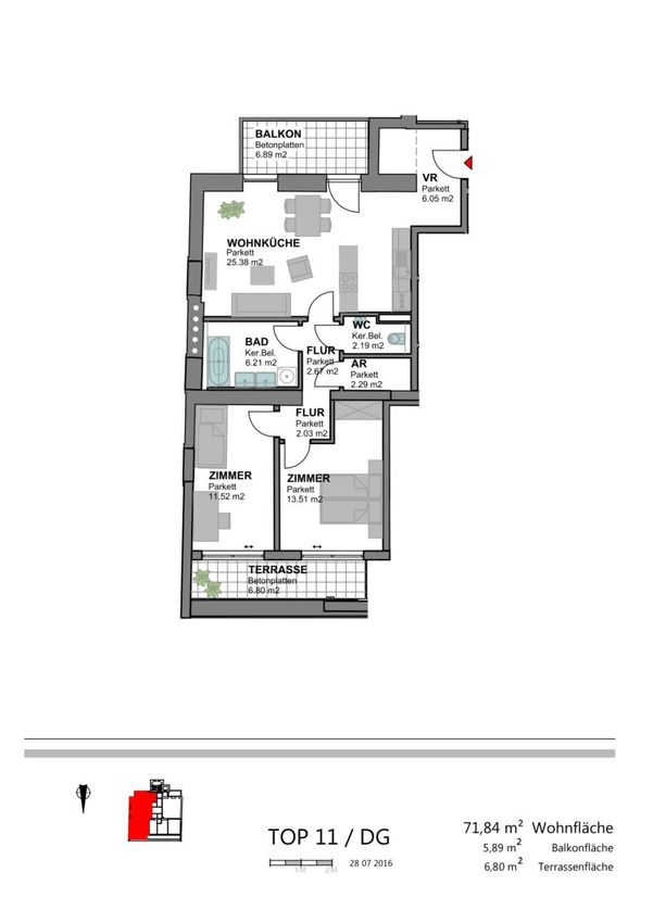71,84 m² Wohnfläche + 5,89 m² Balkon + 6,80 m² Terrasse