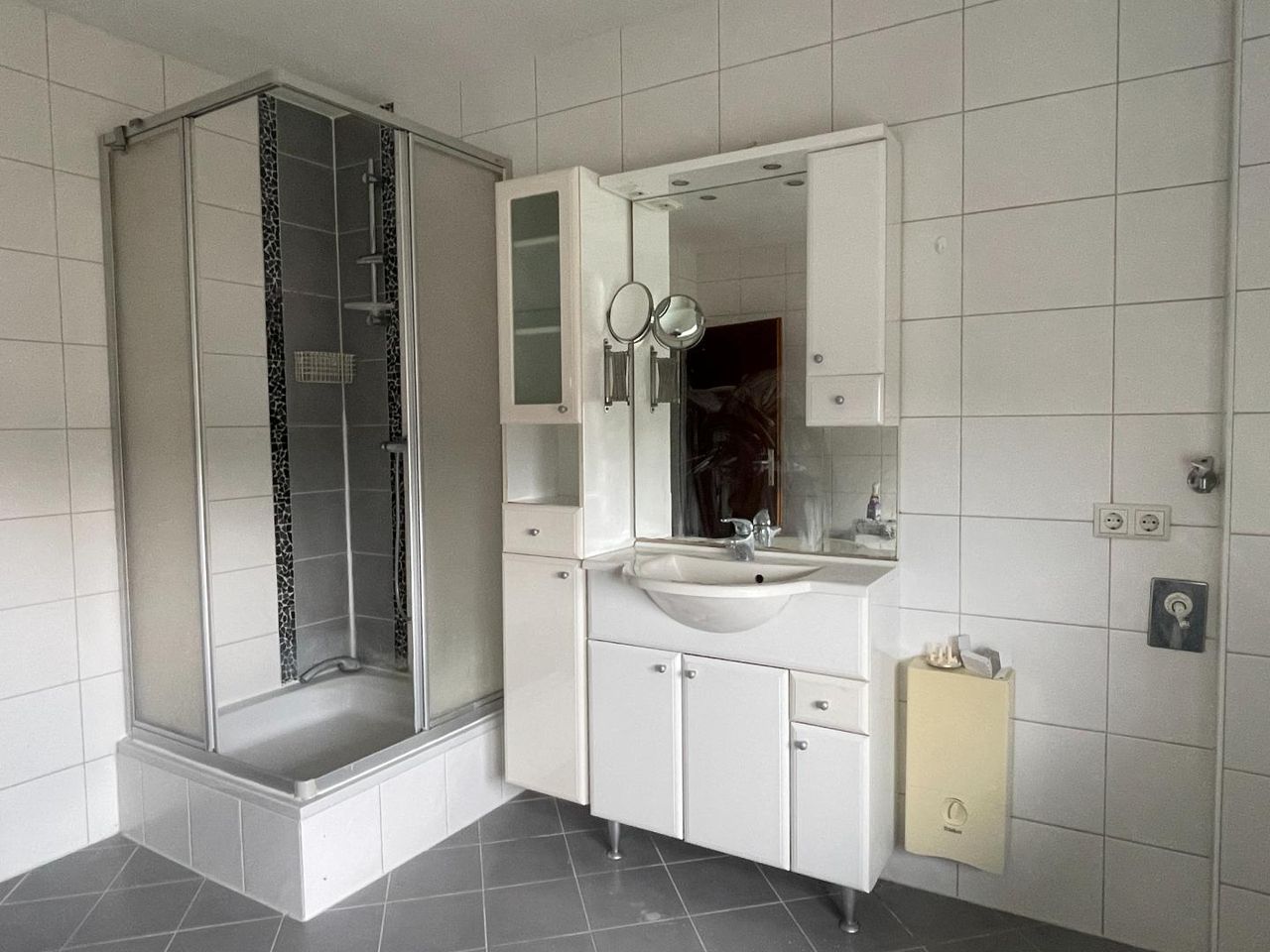 * Badezimmer mit Badewanne, Dusche und Möbeln