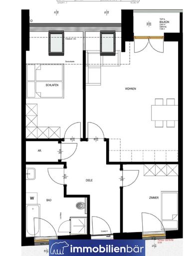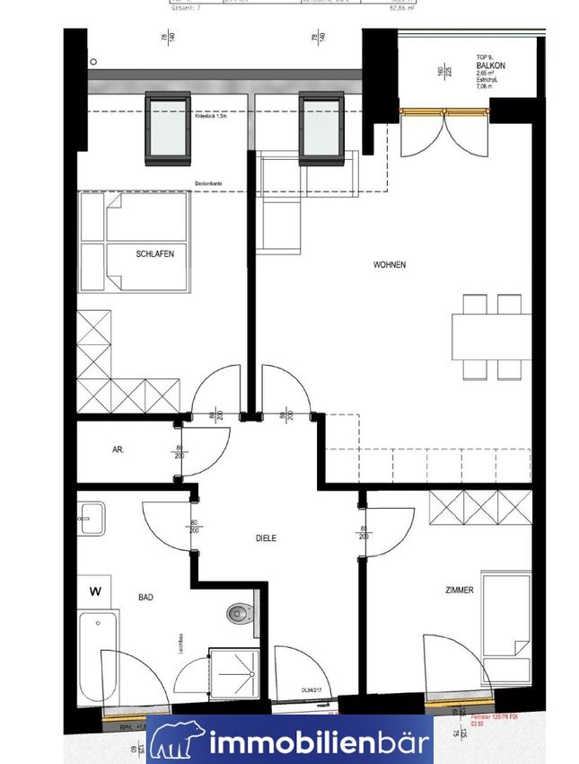 Raumaufteilung: Vorraum, Bad mit Dusche und Badewanne, WC, Schlafzimmer, AR, großer Wohn-Ess-Küchenbereich, Kinderzimmer, Balkon.