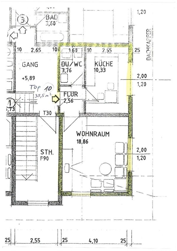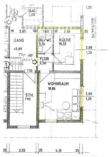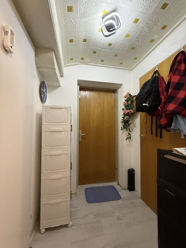 Die Einheit teilt sich auf in Vorraum, Badezimmer mit Dusche und Toilette, Küche (Küchenzeile ohne Kühlschrank) und einem Wohn- und Schlafzimmer. Die Raumhöhe beträgt ca. 2,30 m.