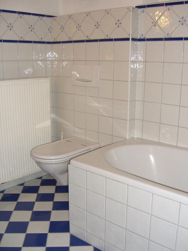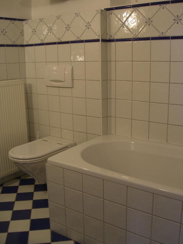 Eine einfache Küche ist möbliert. Das Bad hat eine Badewanne.