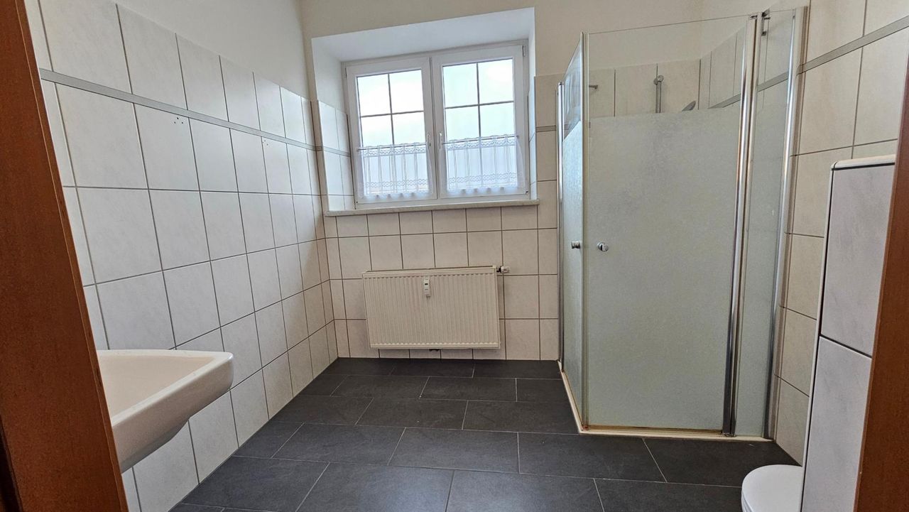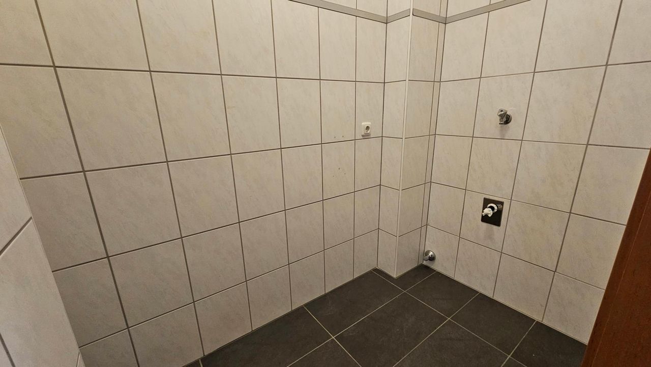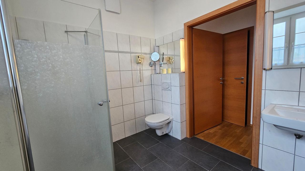 Im Bad ist eine eben begehbare Dusche verbaut.