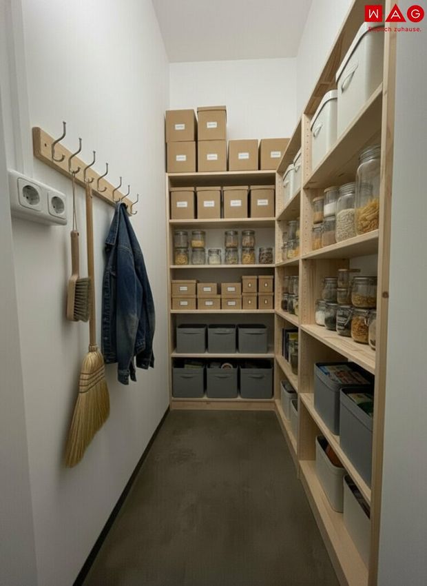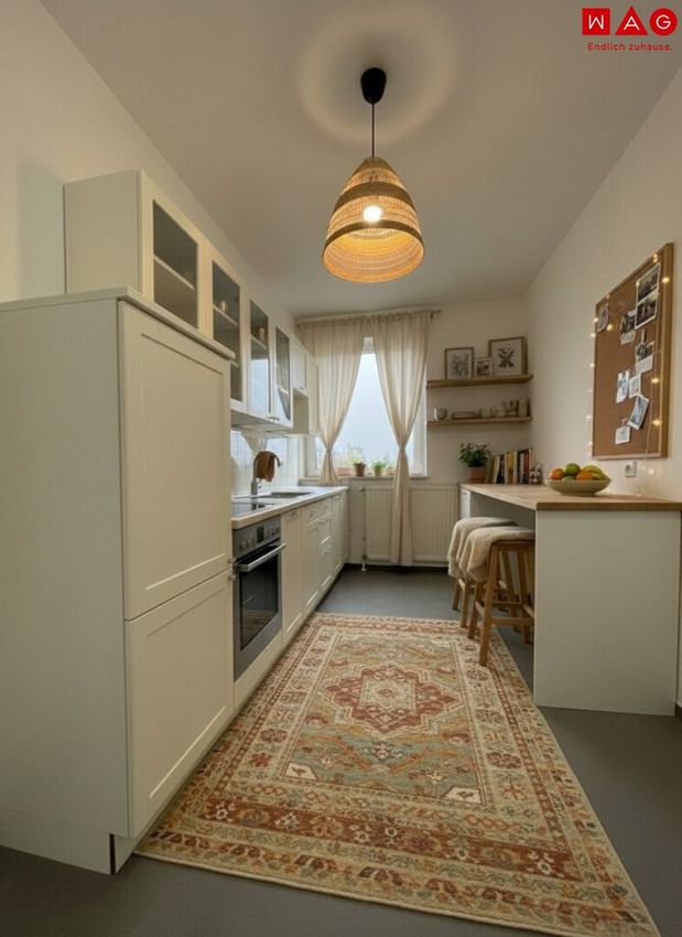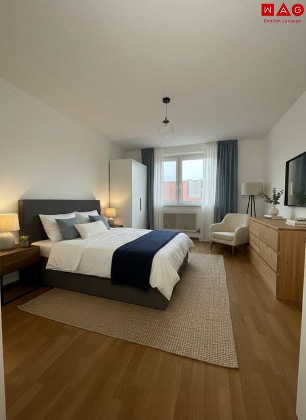 Zur besseren Veranschaulichung des Wohnpotenzials wurde die Einrichtung mithilfe künstlicher Intelligenz dezent visualisiert. Die Möblierung wurde dabei bewusst schlicht gehalten, um die räumlichen Möglichkeiten neutral darzustellen.