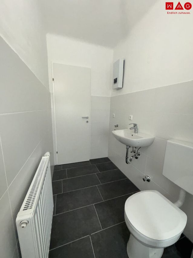 - modern saniertes Badezimmer mit Fenster, ebenerdiger Dusche und WC