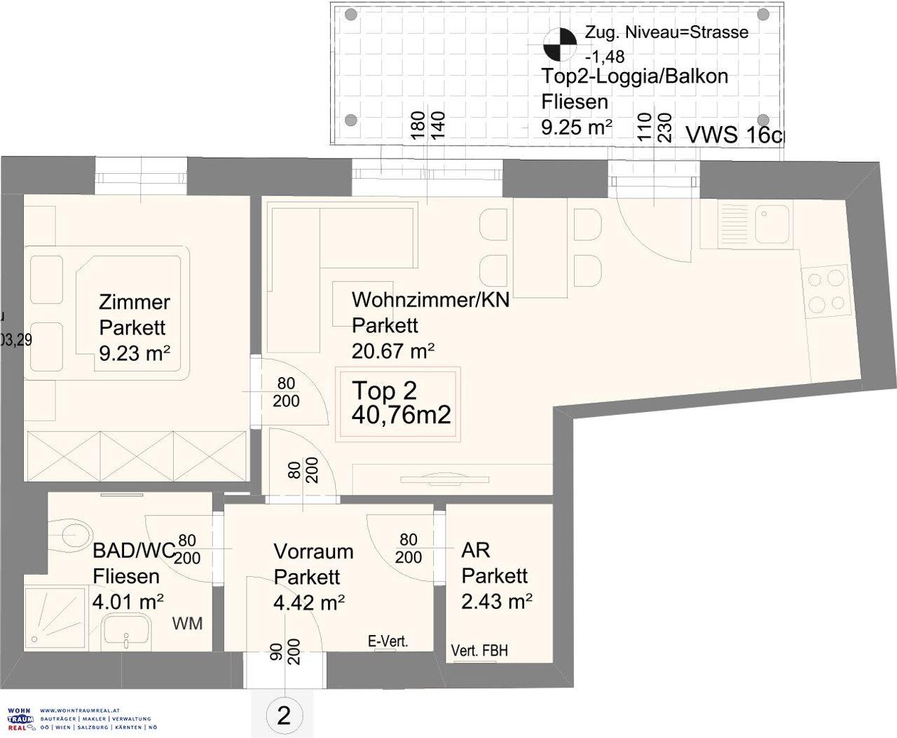 Die 2-Zimmer Wohnung besteht aus einem großen Wohn-Essbereich mit eingebauter Küche und einem Schlafzimmer. Die Wohnfläche mit knapp 41 m² ist für Paare perfekt ausreichend. Hier kommt noch ein Balkon von 9,25 m² hinzu, ein Abstellraum von 2,43 m² und eigenes Kellerabteil mit 2,23 m² ist ebenfalls mit dabei.