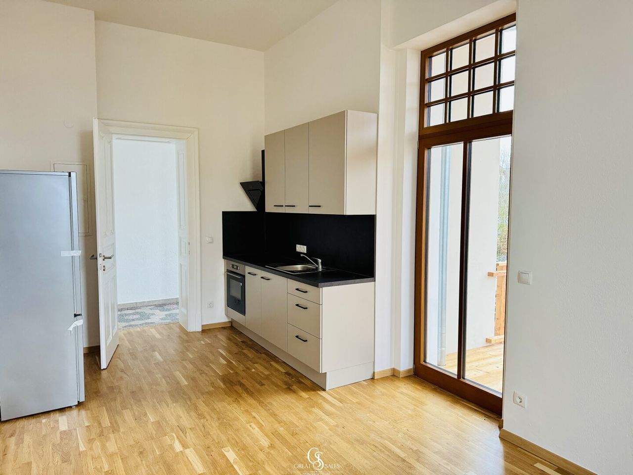 Offene Wohnküche mit hochwertiger Einbauküche & Zugang zum Balkon
