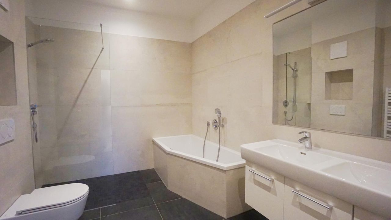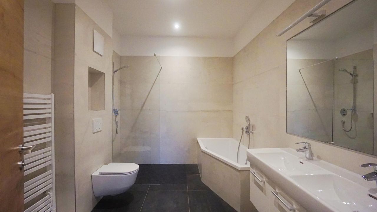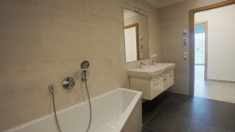 Ein helles Badezimmer mit Regendusche, Badewanne und Doppelwaschbecken lädt zum Wohlfühlen ein und