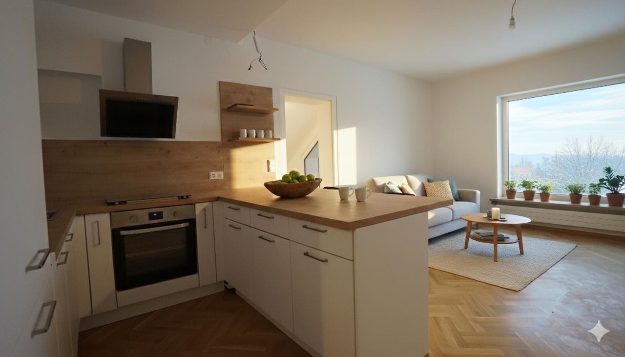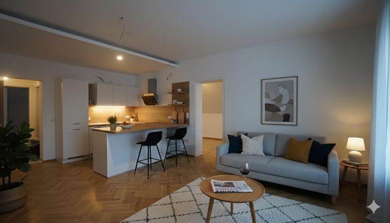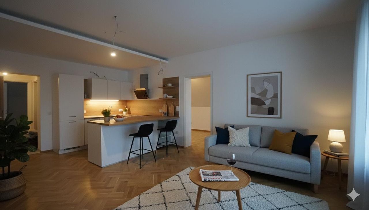 Einige der gezeigten Bilder der Wohnung wurden digital bearbeitet (KI-gestützt), um den Wohnraum