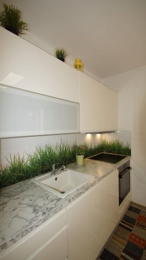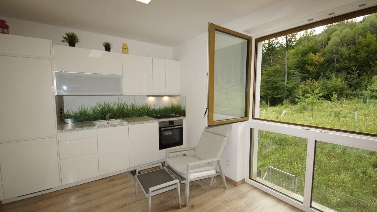 Mit dem Lift fährt man in den 1. Stock und betritt die Wohnung mit Sicherheitstüre vom Gang aus. Vom Vorzimmer gelangt man in die modern eingerichtete Küche mit Spüle, Backofen, Ceranfeld, Dunstabzug, Kühlschrank und Geschirrspüler. Eine Essgarnitur oder bequeme Couch passen locker herein. Momentan steht hier ein Gästebett zusätzlich und ein Relax-Sessel mit Flatscreen.