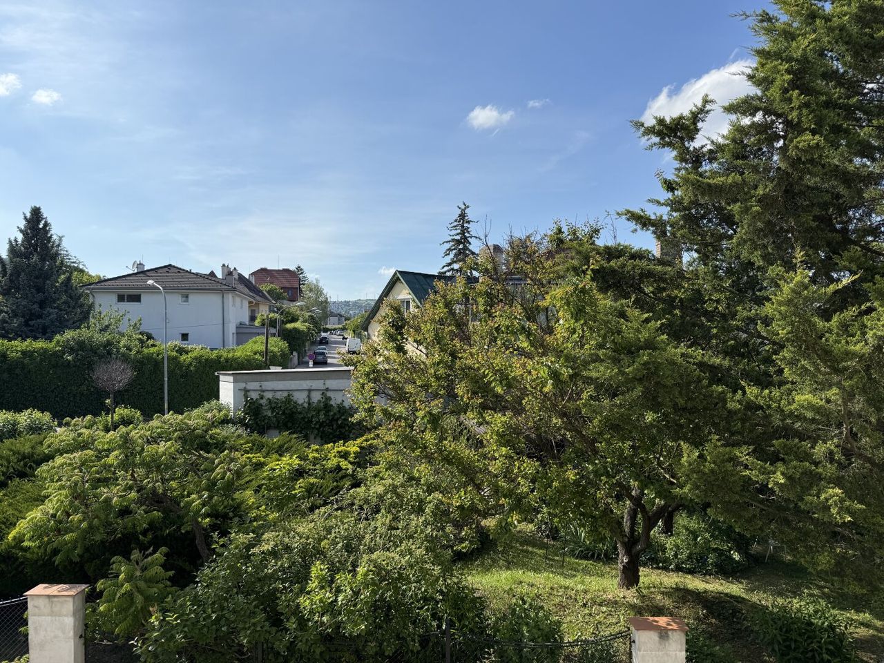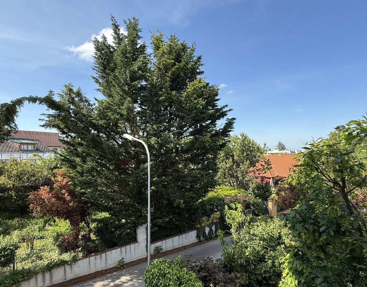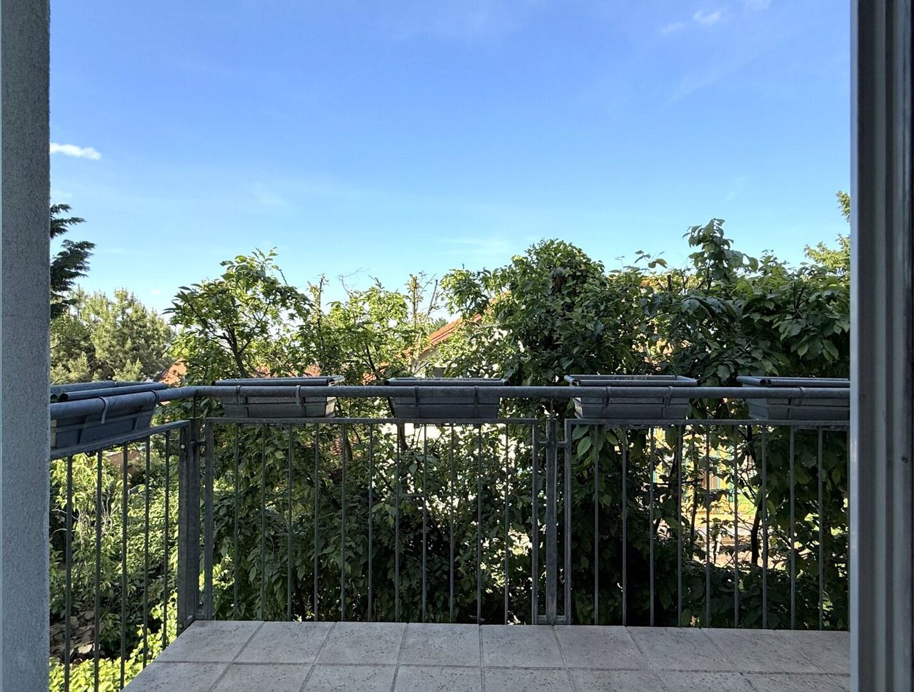 Vom nord-ostseitigen Balkon aus schaut man in Gärten, die genau das tun, was gute Nachbarsgärten tun sollen: schön sein und die Ruhe bewahren.