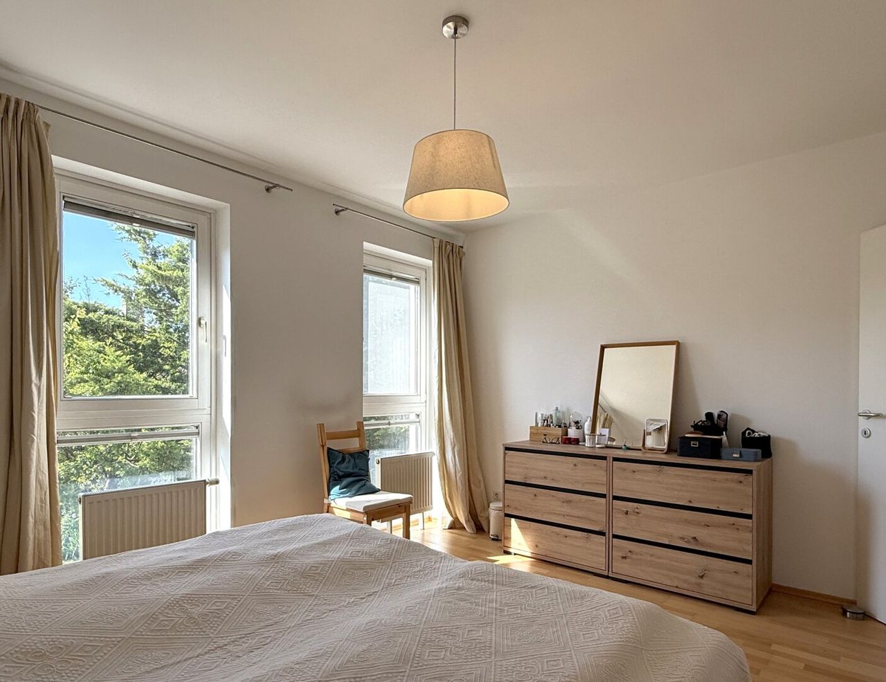 Zimmer Nr. 1 – freundlich, westseitig, mit bodentiefem Fenster und einem grünen Blick in gepflegte Gärten. Sonne, Ruhe und ein bisschen "Landlust" – mitten in der Stadt.