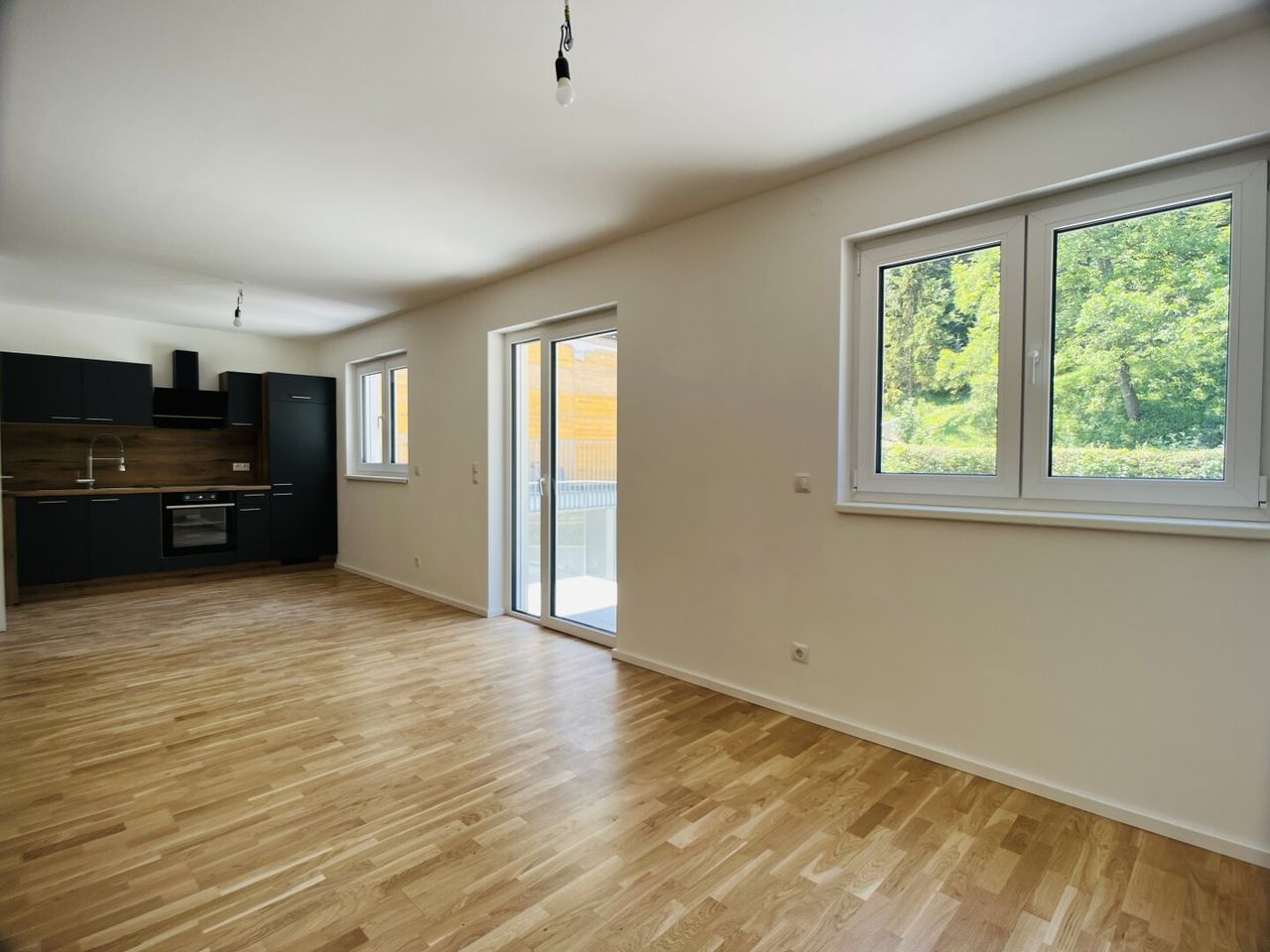 Zur rechten erreichen Sie das sonnige Wohnzimmer, in welchem sich eine geschmackvoll und vollausgestatte Küche (mit Abstellraum) befindet, sowie gelangen Sie vom Wohnzimmer auf den sonnigen Süd-West Balkon mit traumhaften Grünblick.