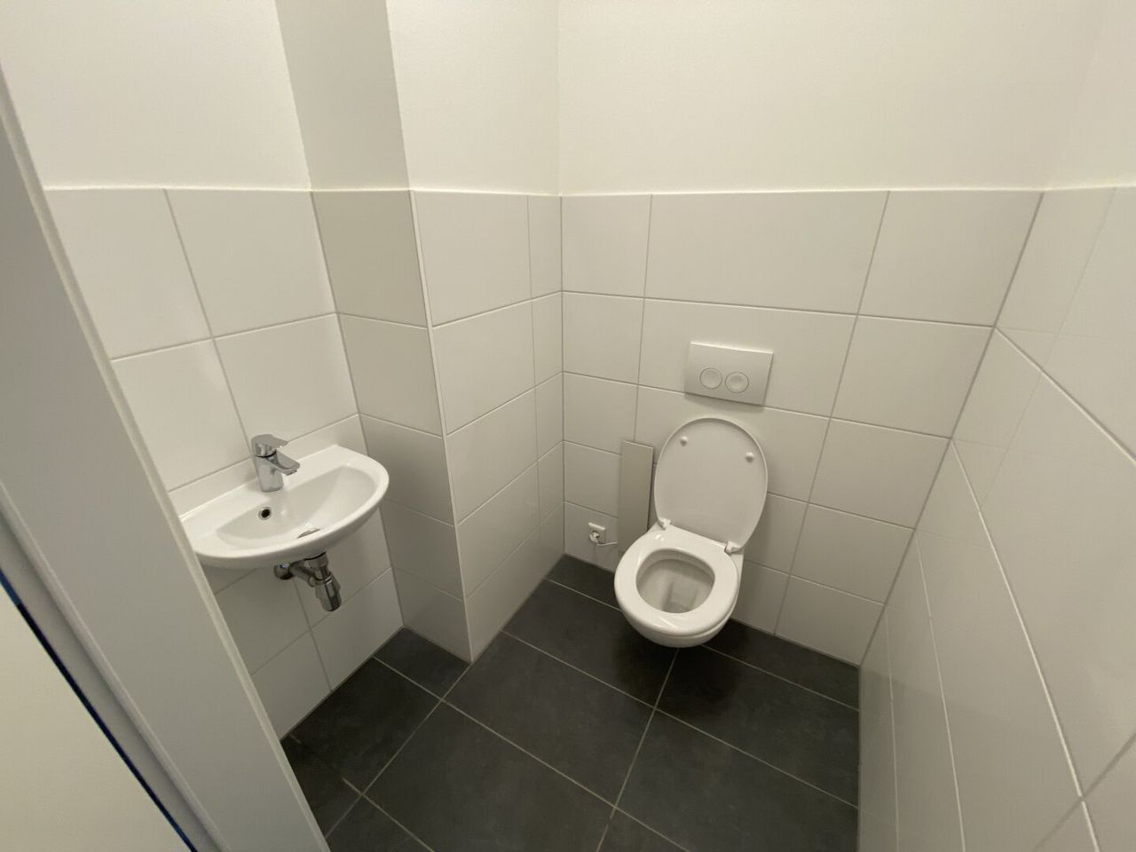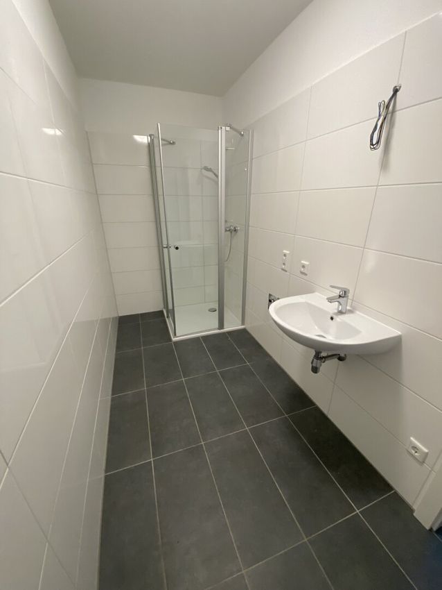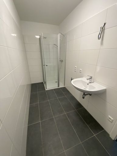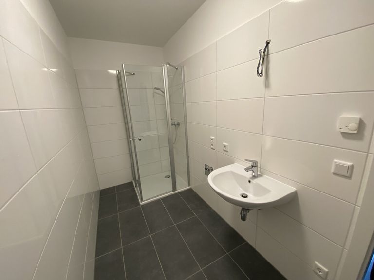- Badezimmer mit Dusche, Waschbecken und Waschmaschinenanschluss