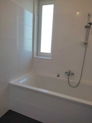 - Badezimmer mit Badewanne, Waschbecken und Waschmaschinenanschluss