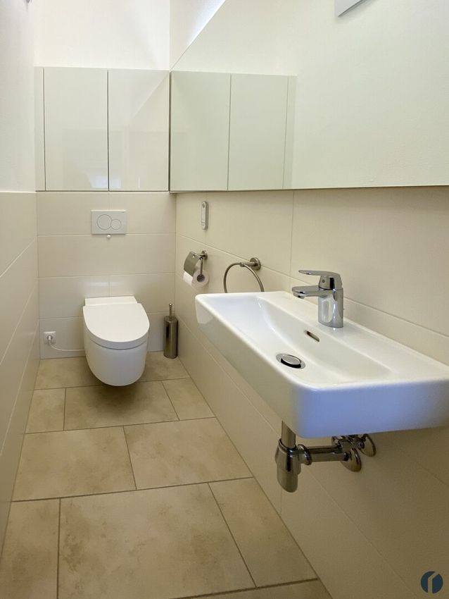 Das separate WC wurde mit einer modernen Duschtoilette sowie einem Handwaschbecken ausgestattet. Ein Abstellraum in der Wohnung und ein separater Einlagerungsraum im Erdgeschoss bieten Platz für zusätzlichen Stauraum. Das Auto kann sehr nahe gelegen am zur Wohnung gehörendem Abstellplatz geparkt werden und ist in der Miete bereits inkludiert.
