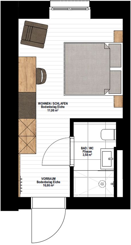 Gemütliche Einzimmerwohnung mit eigenem Badezimmer und WC. Der Eingangsbereich ist mit einer praktischen Garderobe ausgestattet und bietet ausreichend Stauraum für alles, was man im Alltag braucht.