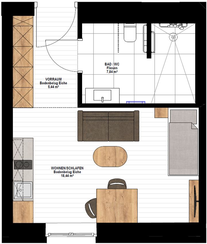 Diese moderne Einzimmerwohnung überzeugt durch Wohn-, Schlaf- und Kochbereich mit voll ausgestatteter Küchenzeile, der ein angenehmes und offenes Wohngefühl schafft. Das komfortable Badezimmer bietet ausreichend Platz und hohen Komfort.