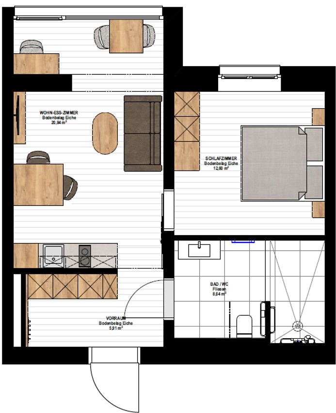 Diese geräumige Wohnung mit zwei Zimmern bietet zusätzlichen Wohnkomfort sowie einen kleinen, vorgesehenen Wintergarten für mehr Freiraum im Alltag. Der einladende Vorraum verfügt über ausreichend Abstellfläche und eine Garderobe. Die voll ausgestattete Küche steht Ihnen kostenfrei zur Verfügung.