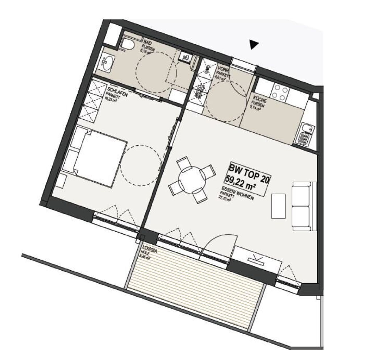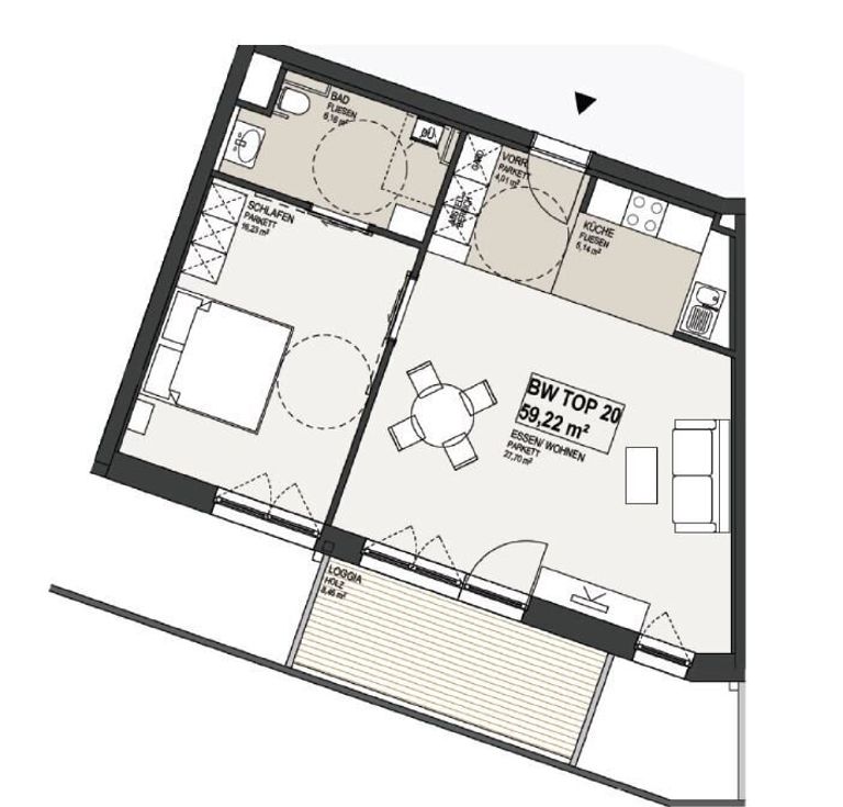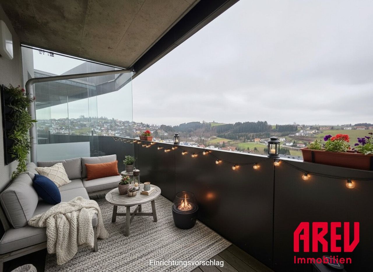 Mit einer großzügigen Fläche von 59,22 m² überzeugt die Wohnung durch einen durchdachten Grundriss, der Ihnen viel Platz zum Entspannen und Wohlfühlen bietet. Der lichtdurchflutete Wohnbereich lädt dazu ein, gemütliche Abende mit Freunden und Familie zu verbringen. Von hier aus gelangen Sie direkt auf die einladende Loggia, die Ihnen einen atemberaubenden Ausblick auf die grüne Umgebung ermöglicht. Genießen Sie die Ruhe und die frische Luft, während Sie Ihre Morgenkaffees oder Abendessen im Freien zelebrieren.
