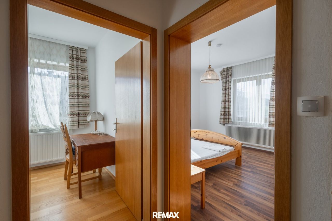 - Wohnzimmer mit Ostbalkon, Schlafzimmer westlich ausgerichtet mit großem Fenster und Blick auf Berge, Wiesen und Wald