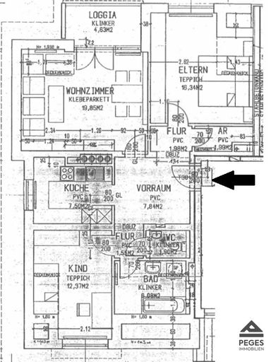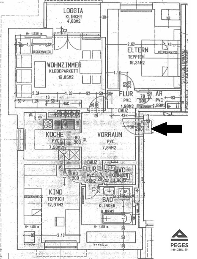 Räumliche Einteilung: Vorraum/ Diele, Abstellraum, Bad (mit Badewanne und WM-Anschluss), WC separat, Küche (eingerichtet), Wohnzimmer mit Ausgang auf Balkon, Schlafzimmer, Kinderzimmer; Kellerabteil, 1 PKW-Stellplatz im Freien, 1 Carport-Platz