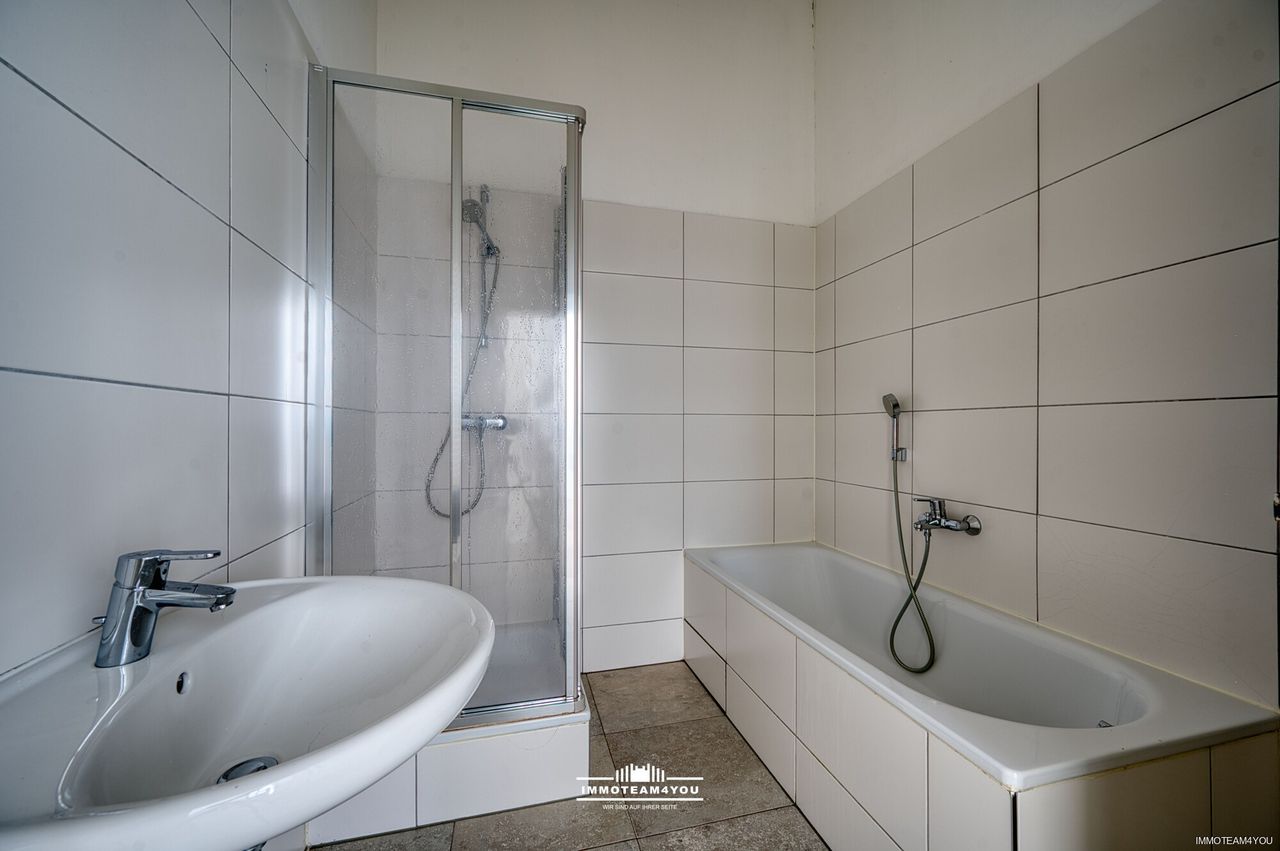 Bad: Mit Dusche, Badewanne, Waschbecken, Fliesen und Waschmaschinenanschluss