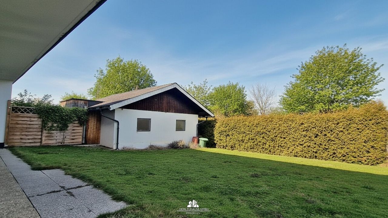 Der große Garten (~180m²) erstreckt sich auf zwei Seiten und wartet auf Ihre Gestaltung: Ruhezone mit Liege, Pavillon, Griller, Hochbeete, Trampolin, Aufstellpool ...