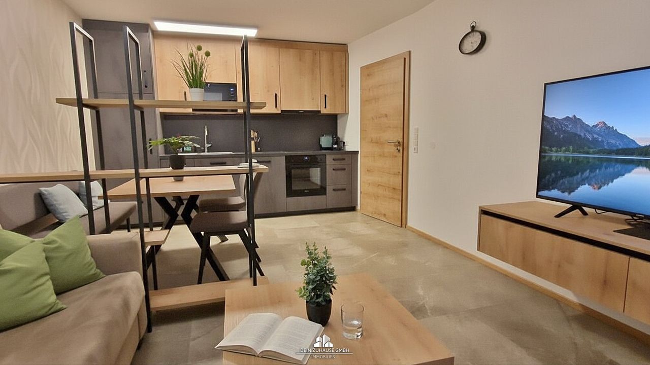 - Wohnraum mit Küche, Esstisch, Couch und TV-Möbel