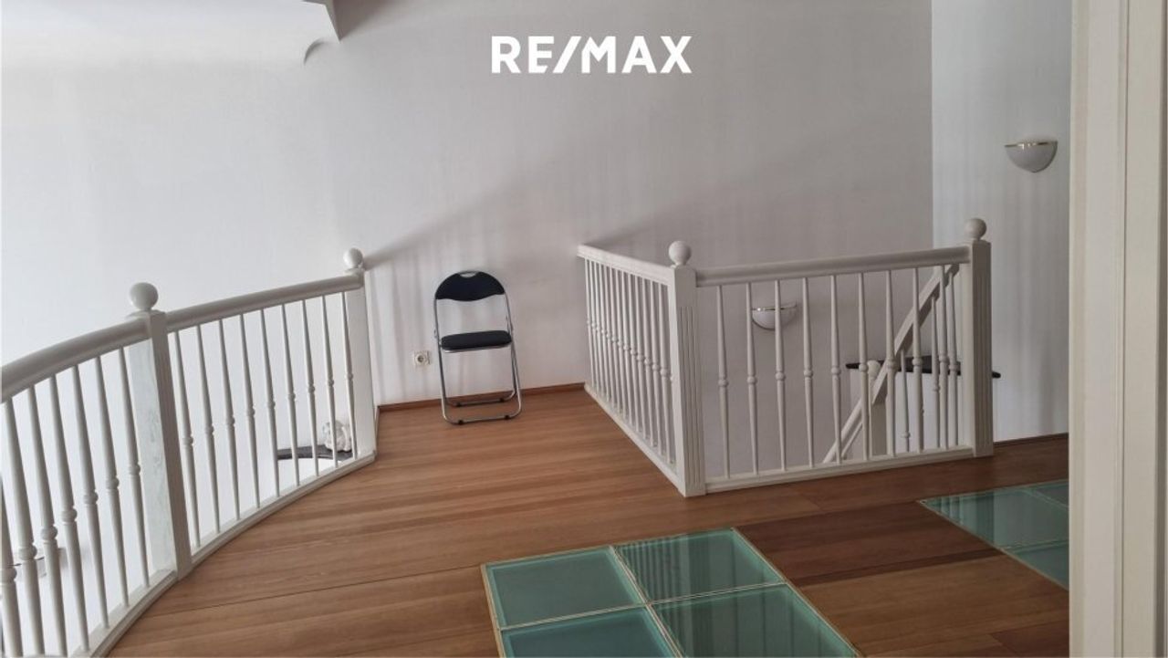 Die untere Ebene bietet einen großzügigen Wohn-Essbereich mit integrierter, voll ausgestatteter Küche sowie ein Gäste-WC. Über eine offene Treppe gelangt man ins Obergeschoss, wo sich ein ruhiges Schlafzimmer mit begehbarem Schrankraum, ein Badezimmer mit Dusche und WC sowie eine kleine Galerie mit Glasboden befinden – ideal als Arbeitsplatz oder Leseecke.
