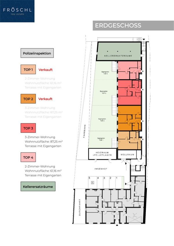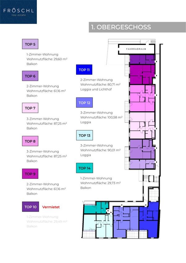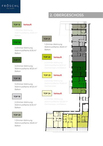 Die Wohnhausanlage umfasst insgesamt 24 moderne Mietwohnungen sowie eine Büroeinheit, die auf drei Geschosse (Erdgeschoss, 1. Obergeschoss und 2. Obergeschoss) verteilt sind. Die Wohnungen Top 5 bis Top 14 im 1. Obergeschoss sind bereits bei Fertigstellung mit einer Einbauküche ausgestattet.