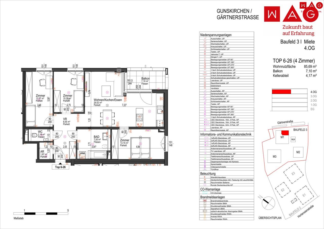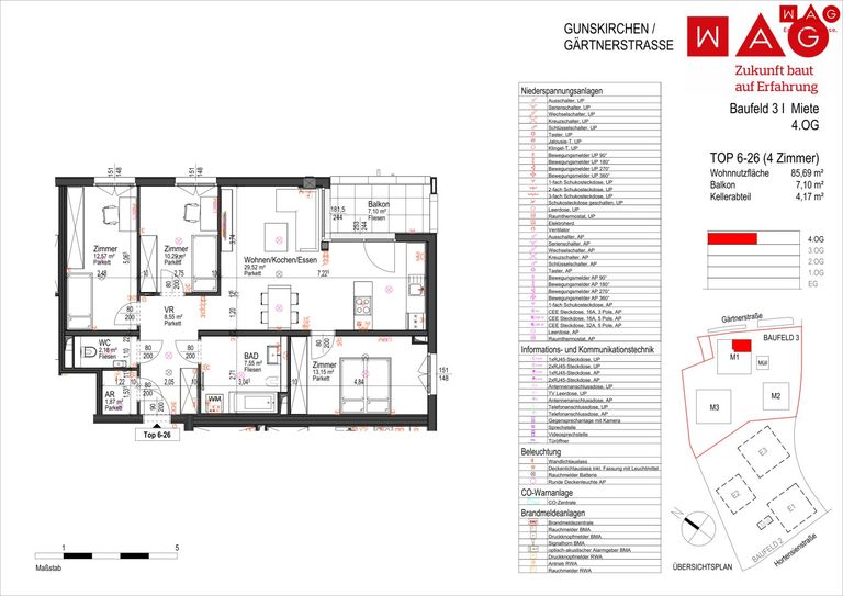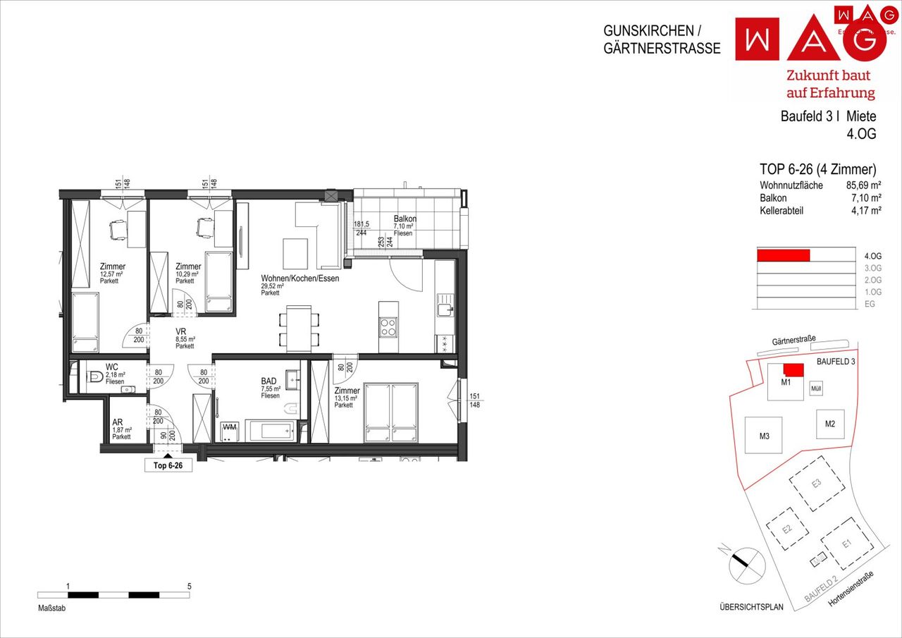 Am ehemaligen Sportplatz in der Gärtnerstraße in Gunskirchen errichtet die WAG drei moderne Wohngebäude mit insgesamt 60 geförderten Mietwohnungen und einer Tiefgarage mit 81 Stellplätzen. Die Anlage entsteht in nachhaltiger Hybridbauweise und bietet Wohnraum für unterschiedliche Lebenssituationen.