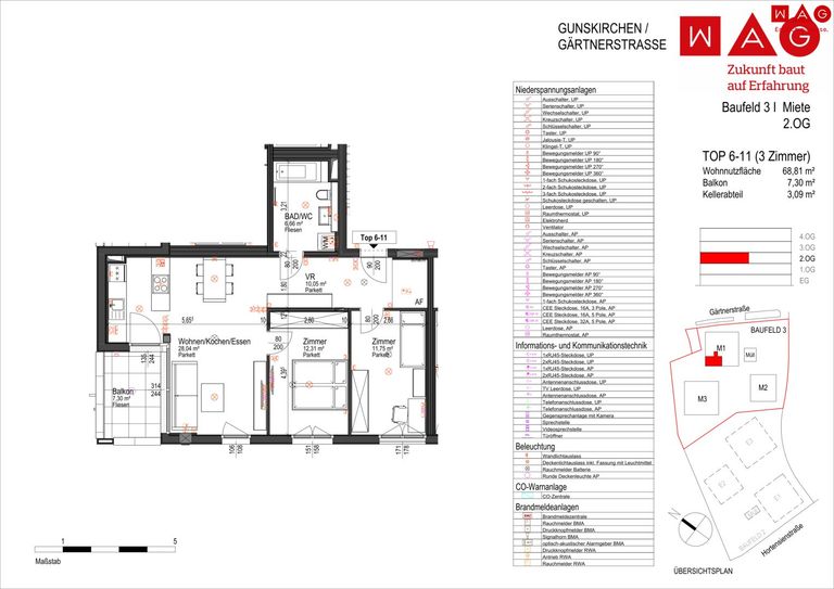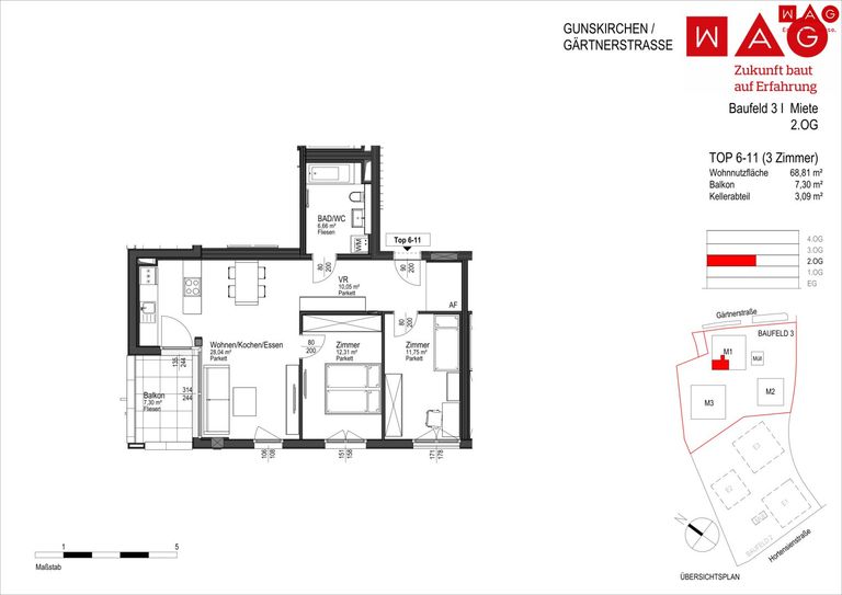 Am ehemaligen Sportplatz in der Gärtnerstraße in Gunskirchen errichtet die WAG drei moderne Wohngebäude mit insgesamt 60 geförderten Mietwohnungen und einer Tiefgarage mit 81 Stellplätzen. Die Anlage entsteht in nachhaltiger Hybridbauweise und bietet Wohnraum für unterschiedliche Lebenssituationen.