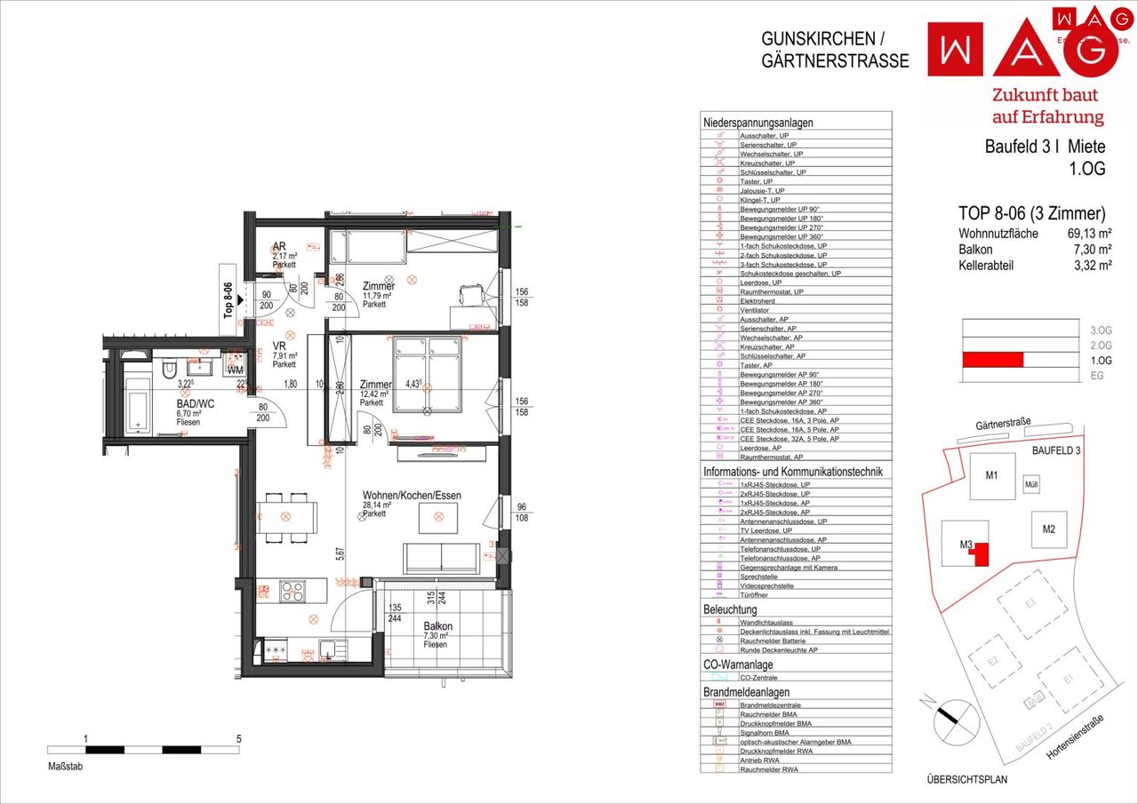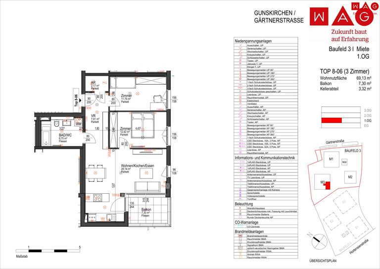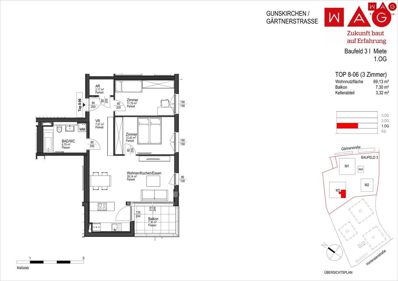 Am ehemaligen Sportplatz in der Gärtnerstraße in Gunskirchen errichtet die WAG drei moderne Wohngebäude mit insgesamt 60 geförderten Mietwohnungen und einer Tiefgarage mit 81 Stellplätzen. Die Anlage entsteht in nachhaltiger Hybridbauweise und bietet Wohnraum für unterschiedliche Lebenssituationen.
