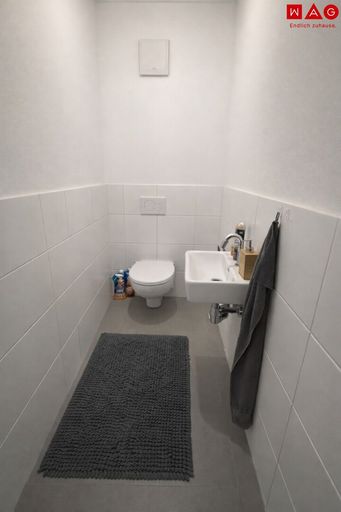 - Badezimmer mit Badewanne, Waschmaschinenanschluss und Warmwasserboiler