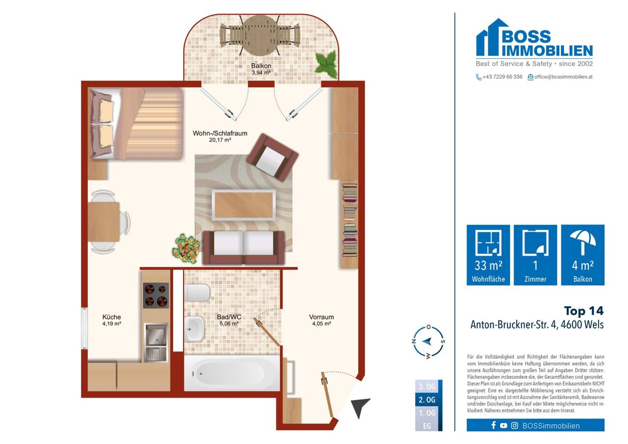 > Wels | Wohnung | Mieten < Diese charmante, etwa 33 m² große Wohnung mit einem ca. 4 m² großen Balkon liegt im 2. Obergeschoss eines gepflegten Wohnhauses und könnte schon bald Ihr neuer Lebensmittelpunkt werden. Ideal als erste Wohnung, für Singles oder Berufspendler!