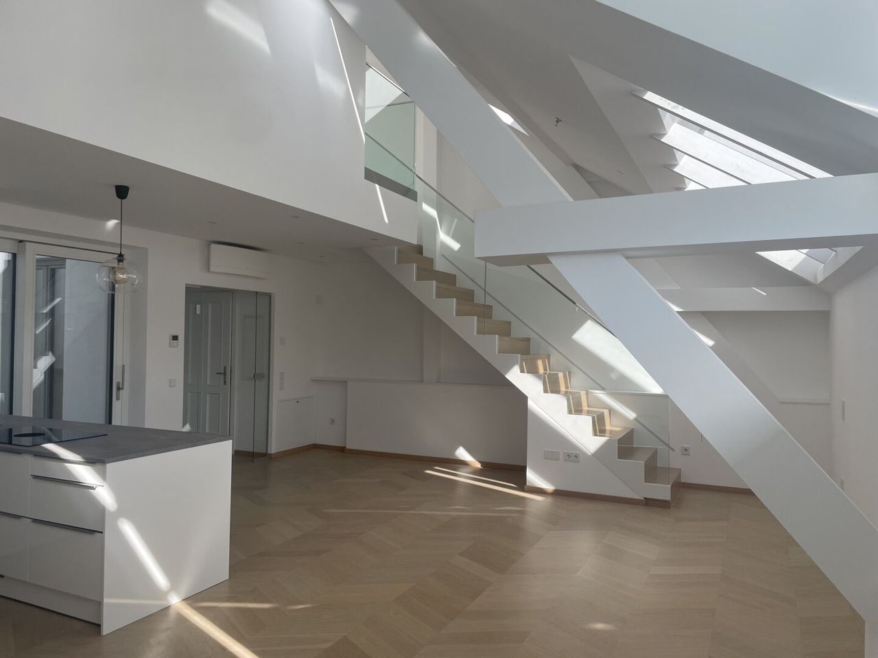Die Maisonetten-Wohnung besticht neben ihrer raffinierten und modernen Gestaltung ebenfalls mit der zentralen Lage im Herzen von Wien! Die Zugänge innerhalb der Wohnung erfolgen teilweise zentral, wobei Sie direkt im Vorzimmer von einem Abstellraum mit Waschmaschinenanschluss und einem großzügigen Garderobenbereich empfangen werden. Von hier aus gelangen Sie direkt hindurch durch die Wohnküche auf die...