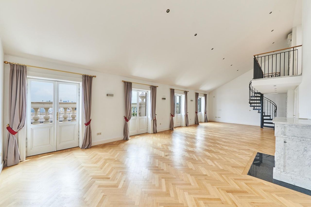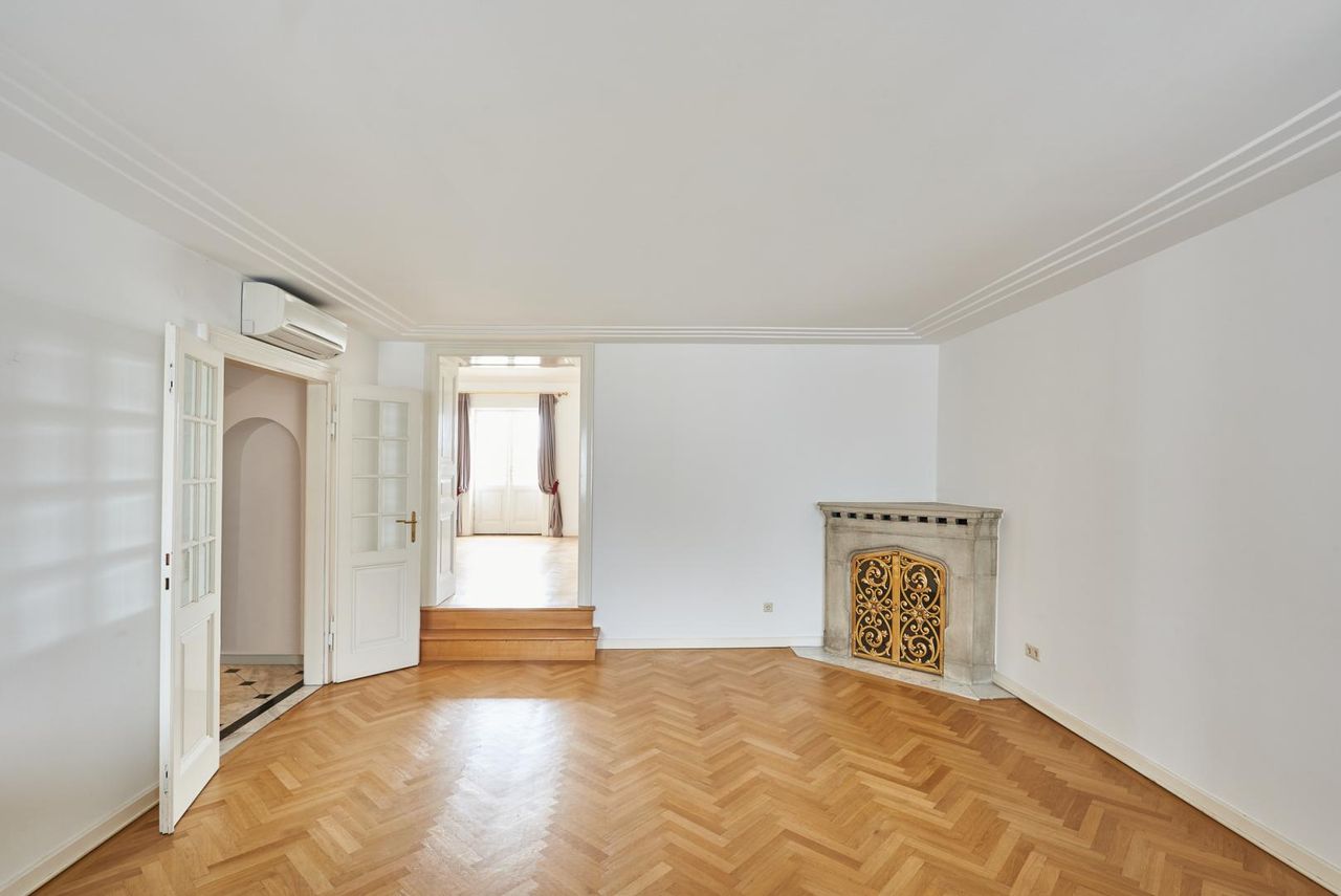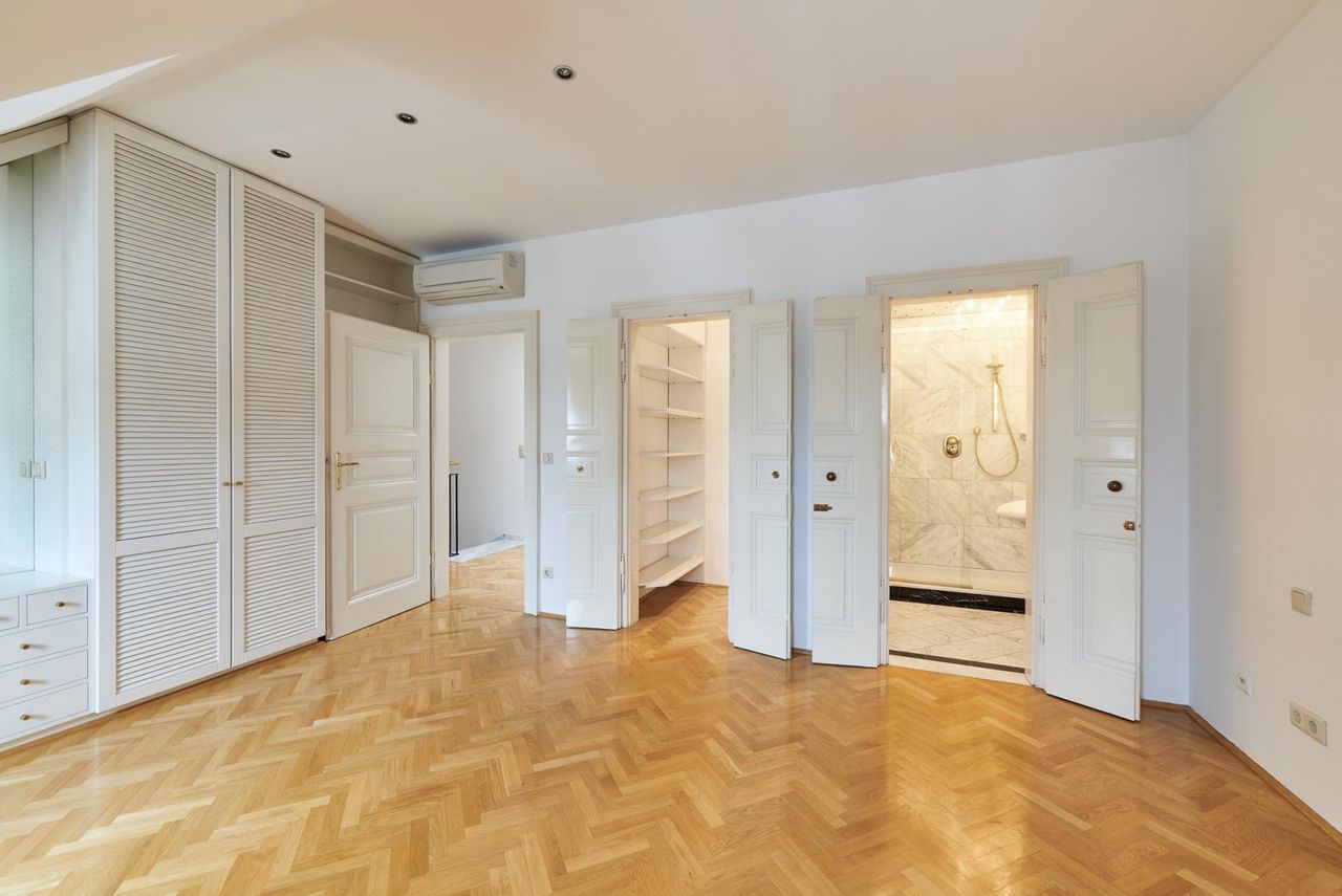 Diese Wohnung erstreckt sich über ca. 214m² Wohnfläche und verfügt über zwei Schlafzimmer plus zwei Bäder, drei Toiletten, einer Garderobe und einer Komplettküche. Sie wurde 2012 komplett neu adaptiert und glänzt mit historischen Elementen wie einem originalen Barockkamin, Jugendstilglasfenster, Stuckdecken und historischen Luster.