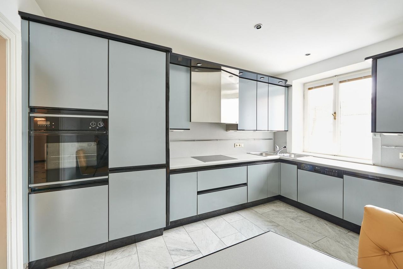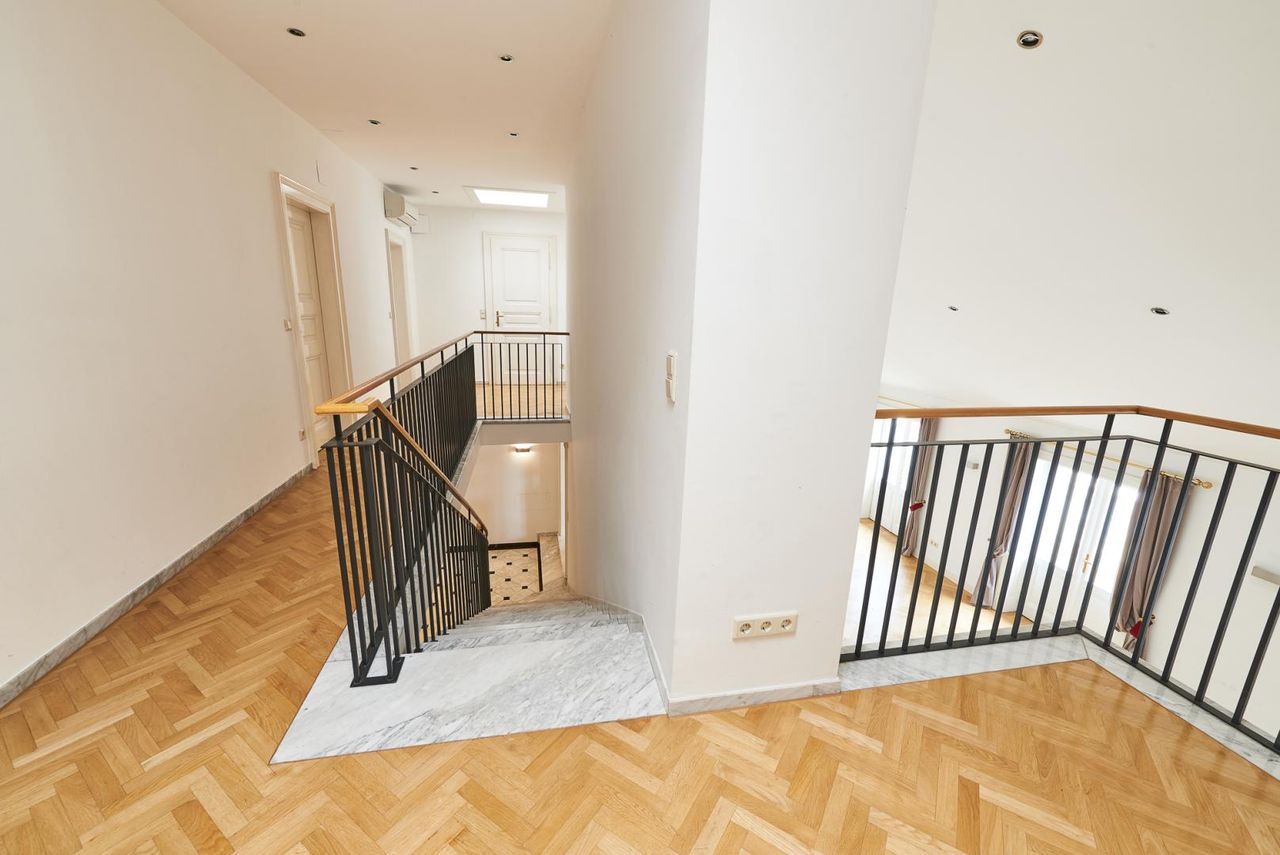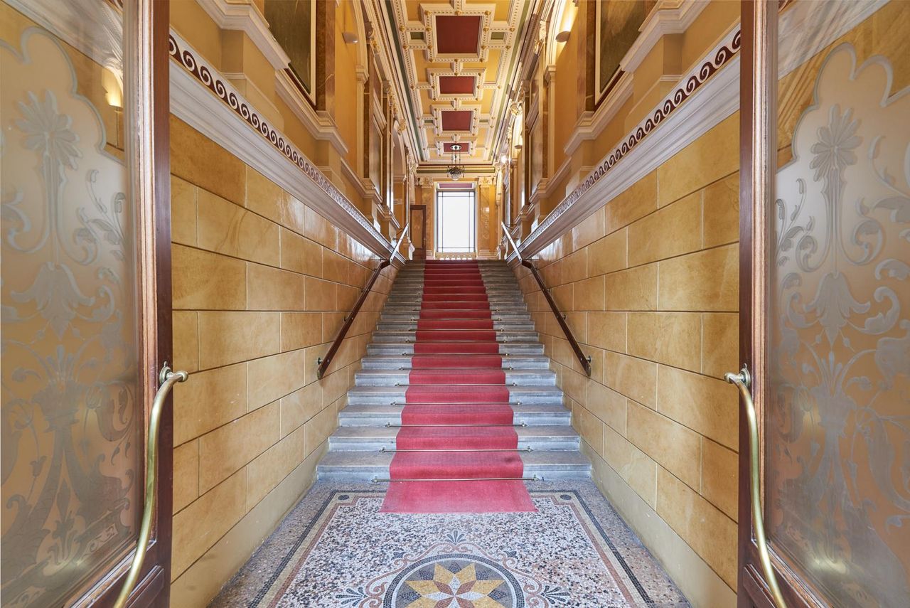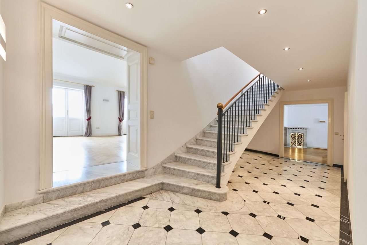 Diese Wohnung erstreckt sich über ca. 214m² Wohnfläche und verfügt über zwei Schlafzimmer plus zwei Bäder, drei Toiletten, einer Garderobe und einer Komplettküche. Sie wurde 2012 komplett neu adaptiert und glänzt mit historischen Elementen wie einem originalen Barockkamin, Jugendstilglasfenster, Stuckdecken und historischen Luster.