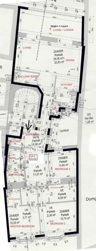 Renovierte Wohnung, 157 m2 im 3. Stock mit Aufzug. Wohnzimmer mit kompletter und öffenbarer Fenster-Front zum grünen Innenhof gerichtet, 3 Schlafzimmer (1 mit en-suite-Bad, 1 mit begehbarem Schrankraum), 2 Bäder, 3 WCs, Küche, separater Wirtschaftsraum mit Waschmaschine und Wäschetrockner. Unmöbliert (ausser Küche, Hauptbad, Schrankraum). Kellerabteil. Hinweis: Die beiden Bäder sowie das WC im Vorraum/Korridor wurden erst kürzlich general-erneuert.
