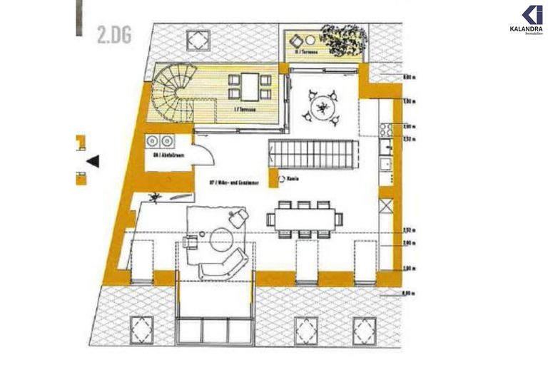großes Wohn-& Eßzimmer mit offen gestalteter Küche und direktem Ausgang auf eine ca. 17m² große, innenhof-nordostseitige Terrasse;