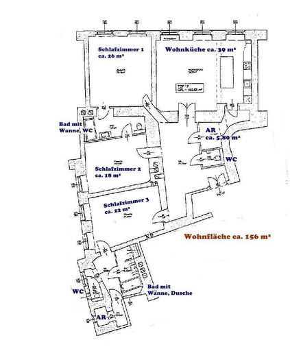 + 3 getrennte Schlafzimmer (ca. 26m² + 22m² + 18m²)