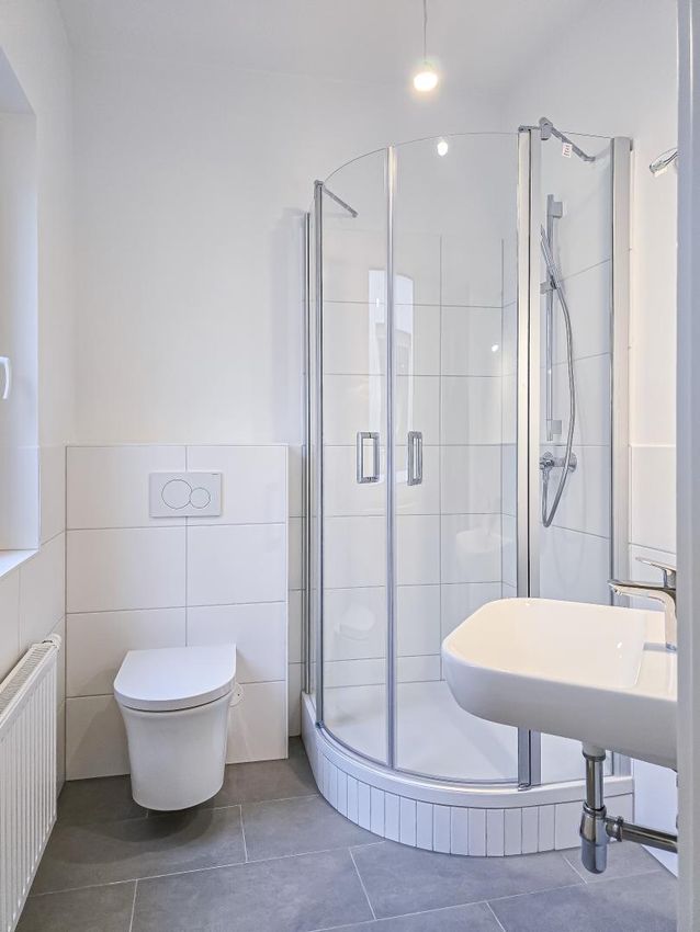 Die Wohnung verfügt außerdem über mehrere Sanitärräume, darunter ein Badezimmer mit Badewanne, eine zusätzliche Dusche mit WC sowie ein separates WC, was besonders für Familien oder Wohngemeinschaften einen hohen Wohnkomfort bietet.