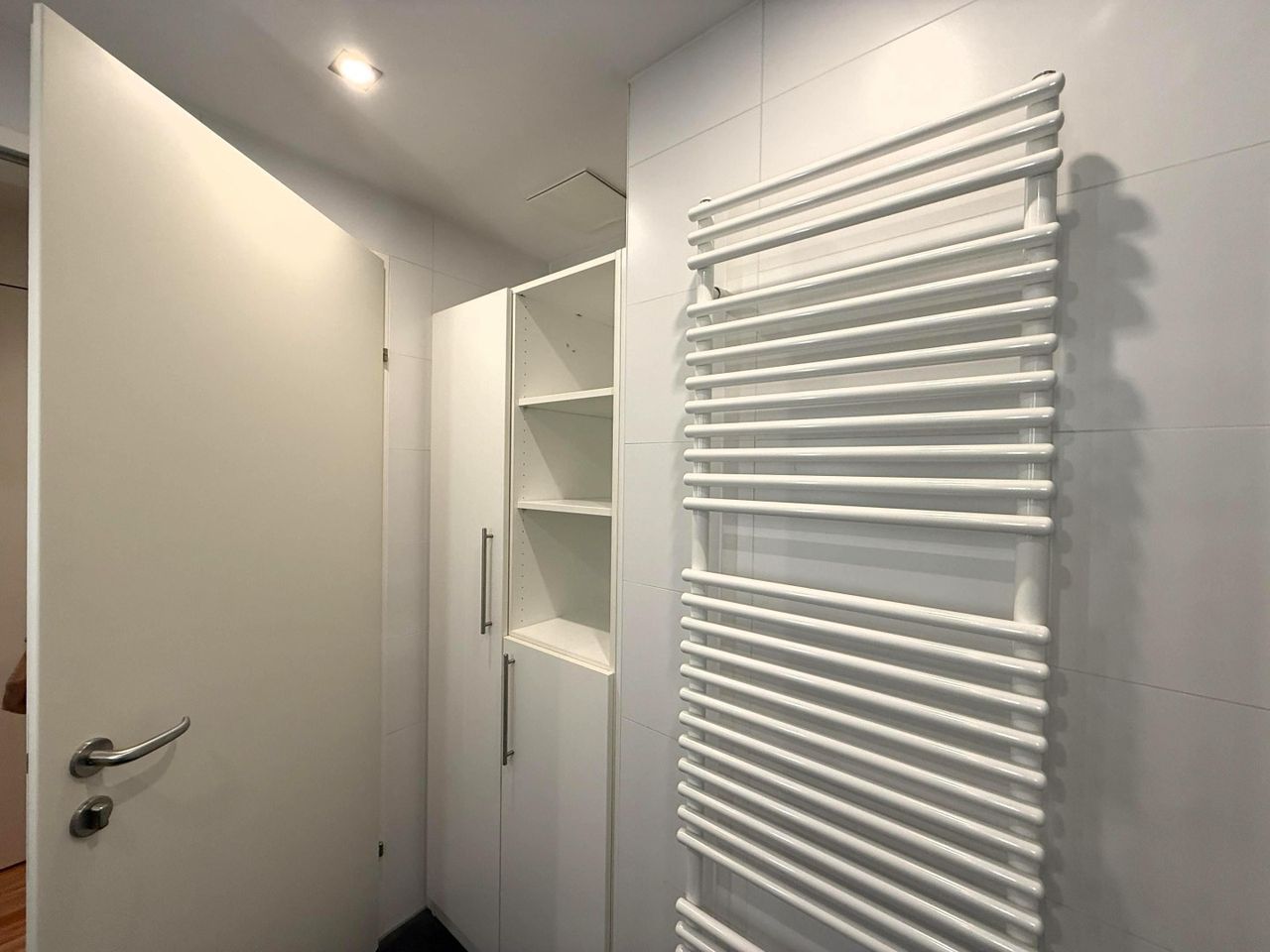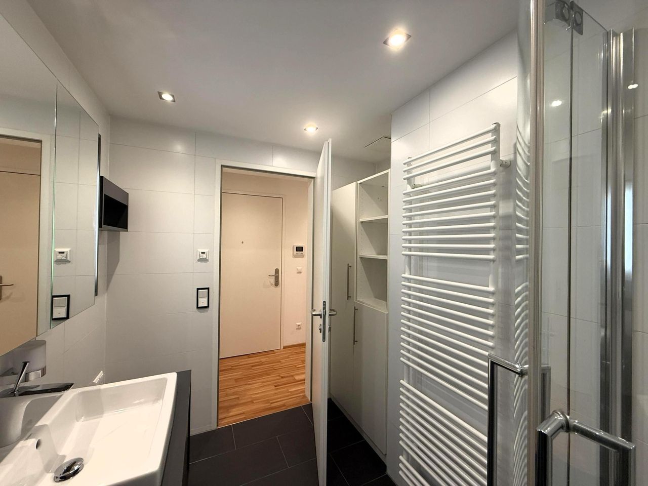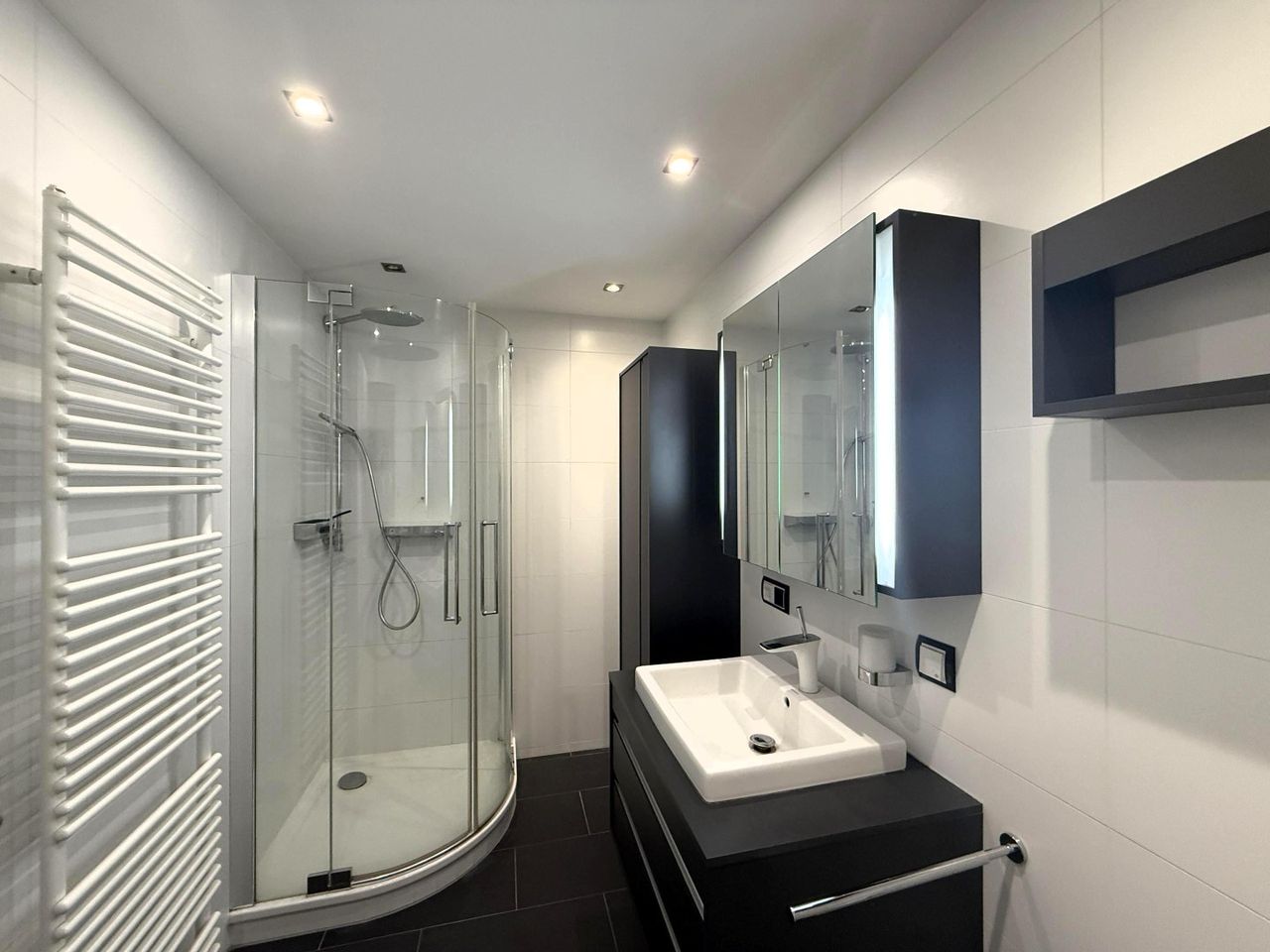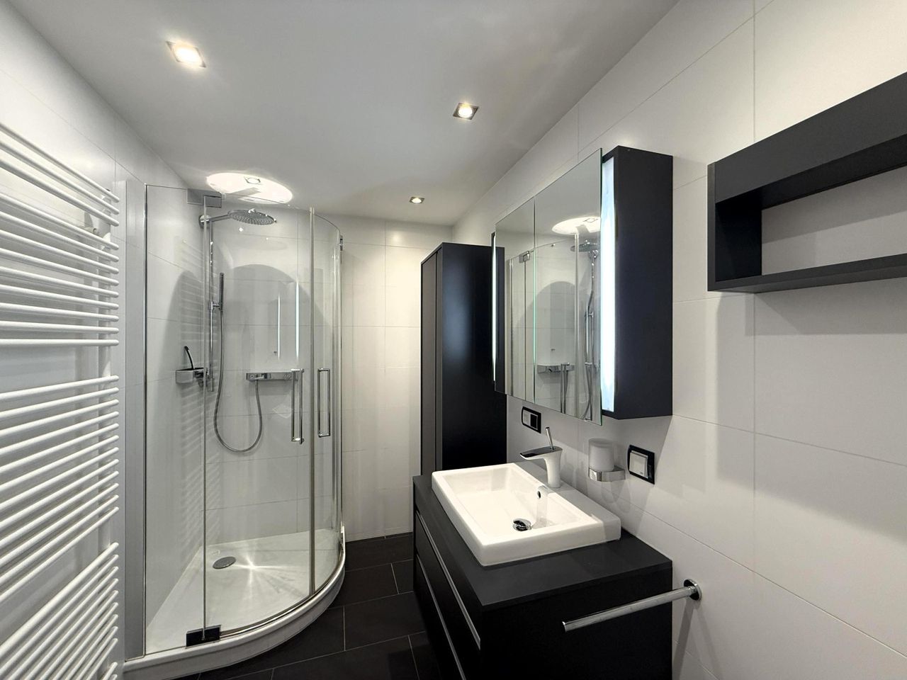 Waschbeckenunter- und verspiegelter Oberbauschrank / Spiegelschrank, Handtuchhalter, Dusche, Duschtrennwand, Handtuchtrockner, Regendusche, Einbauschrank, Hochschrank, Deckenbeleuchtung Einbauspots