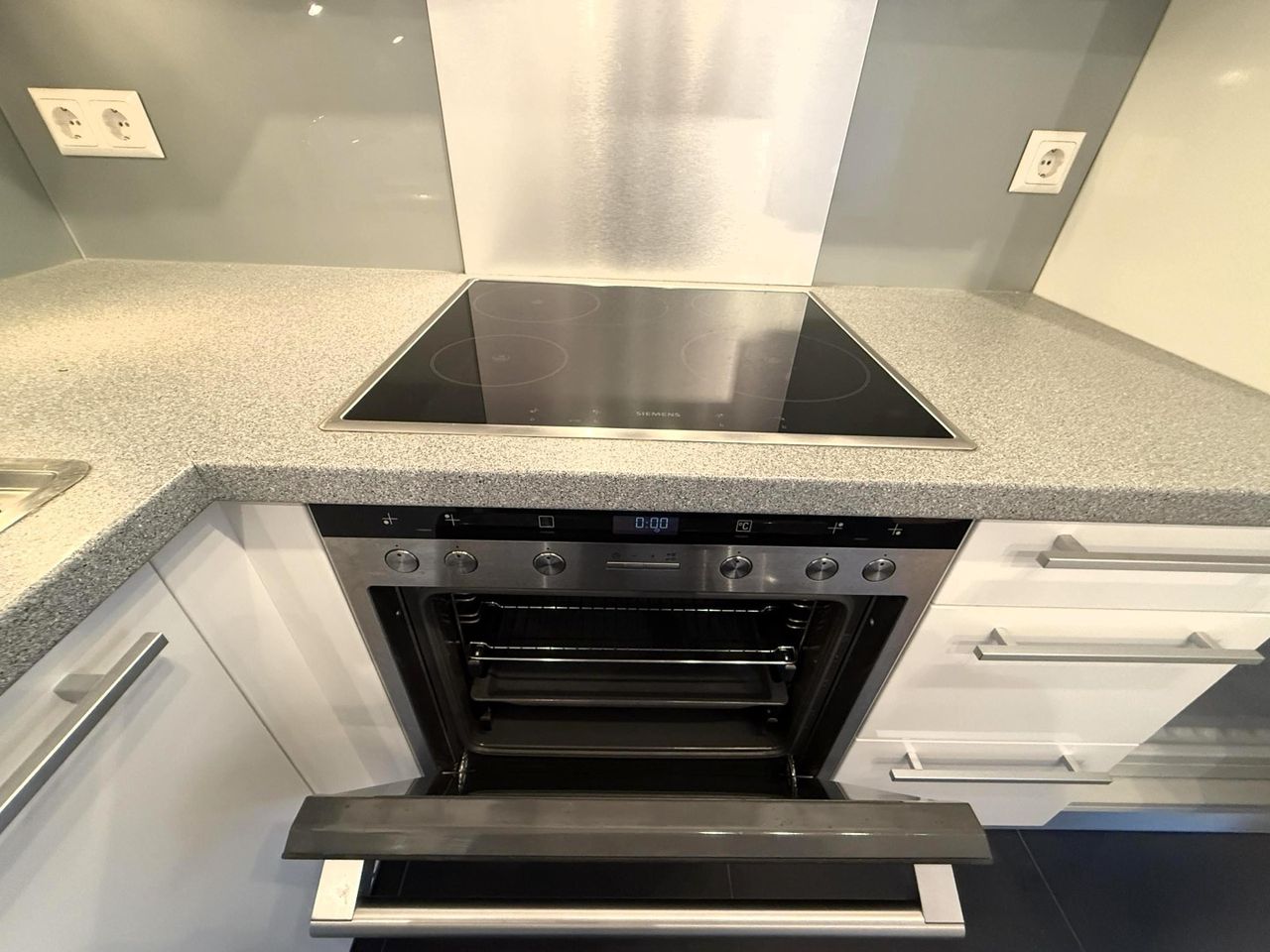 Fitted kitchen including all Siemens appliances, which are built-in: microwave, oven, induction hob, refrigerator/freezer, dishwasher, extractor fan, worktop lighting, interior blinds