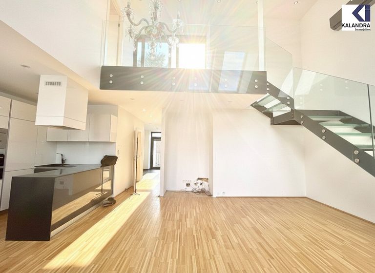 Raumaufteilung Vorraum , Wohnesszimmer mit Loftfeeling, mit verbauter Designerküche Schlafzimmer, Bad mit Badewanne, Waschtisch, Spiegel und WC 7m² Innenhofbalkon, Innenstige in die Galerieebene mit kleinem Zimmer 33m² Dachterrasse mit Fernblick