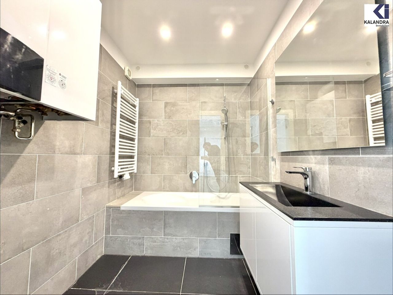 hochwertiges Badezimmer mit Verfliesung, Badespiegel, Badewanne und Handtuchradiator