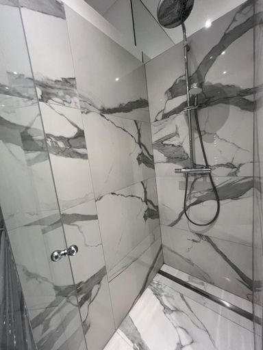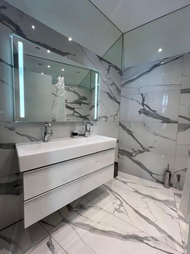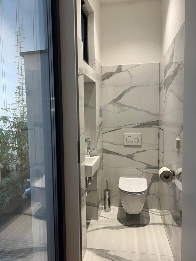 Großer Vorraum (Empfangs)-Raum, offen zur (offenen) Küche und dem großzügigen Wohnsalon. Gäste-WC, Lichthof-Garten, Hauptschlafzimmer mit en-suite Bad + geräumigen Ankleidezimmer mit Waschmaschinen- (und Trockner)-Nische. 2 weitere Schlafzimmer - ein größeres, ein weniger großes. Das kleinere Schlafzimmer verfügt über das en-suite-Bad.