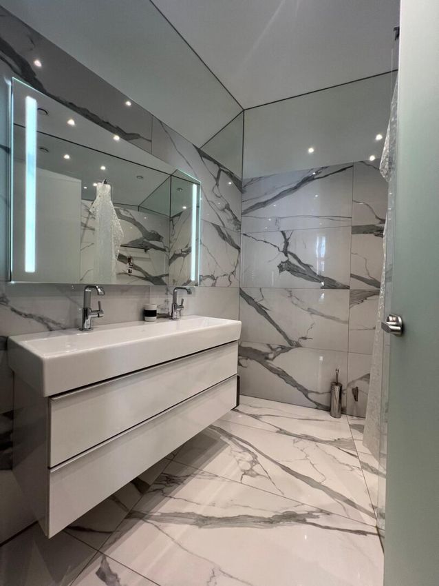Großer Vorraum (Empfangs)-Raum, offen zur (offenen) Küche und dem großzügigen Wohnsalon. Gäste-WC, Lichthof-Garten, Hauptschlafzimmer mit en-suite Bad + geräumigen Ankleidezimmer mit Waschmaschinen- (und Trockner)-Nische. 2 weitere Schlafzimmer - ein größeres, ein weniger großes. Das kleinere Schlafzimmer verfügt über das en-suite-Bad.